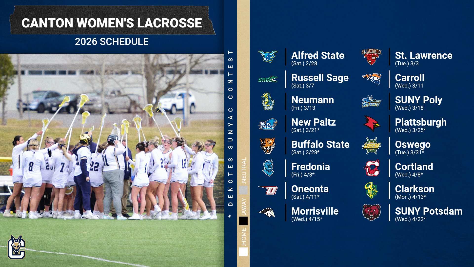 After a non-league game at Keuka (3/25), the team opens NAC play at SUNY Poly (4/1) to kick off the month of April. Another non-conference game at Medaille (4/4) is followed by NAC road games at NVU-Lyndon (4/8), Husson (4/15) and Maine Maritime (4/16). Canton makes the short trip up Route 11 to square off with SUNY Potsdam on April 19th, the team's final road tilt of the year.