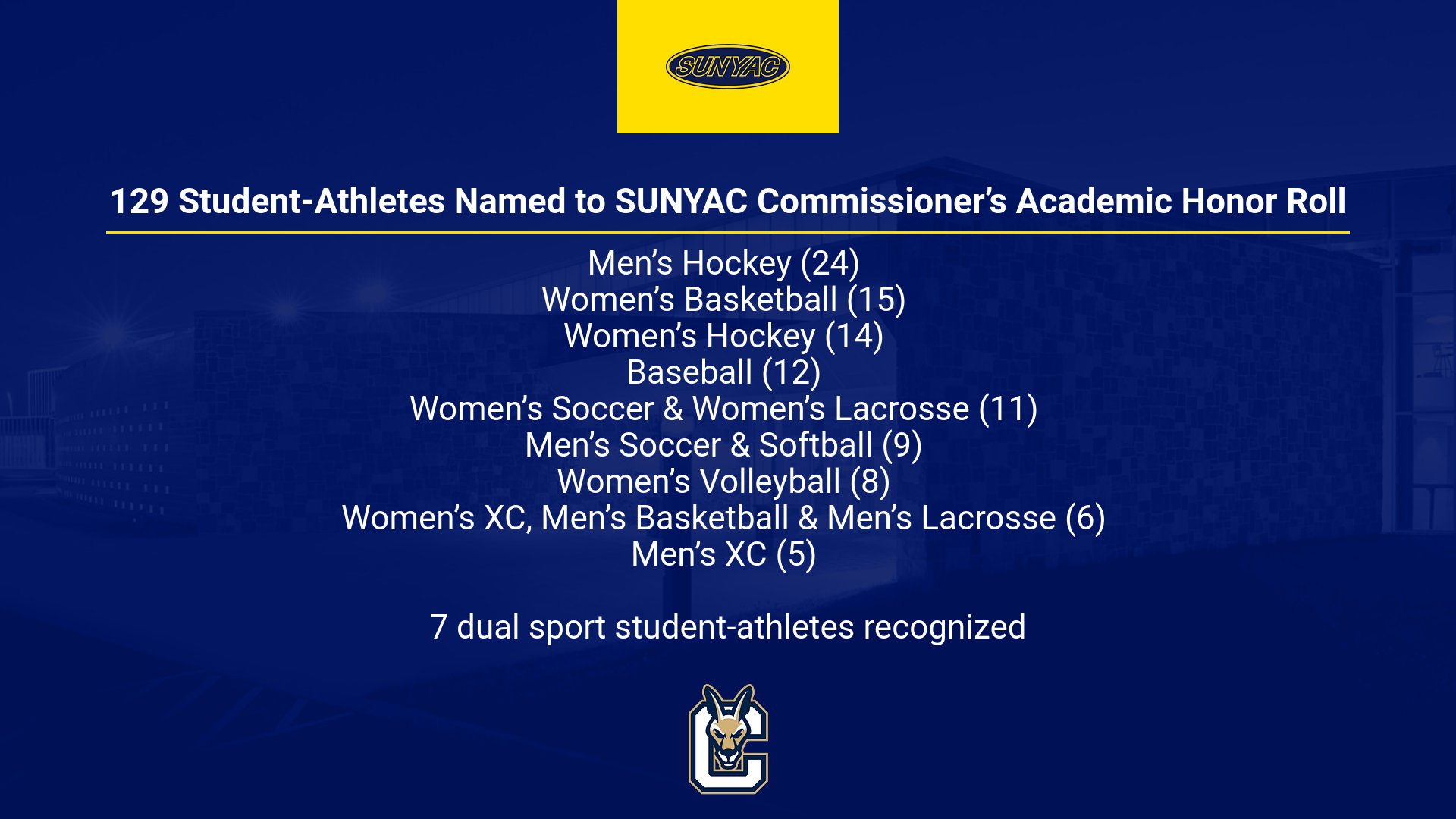 There was also a Game of the Year award with four finalists: the women's hockey team's 1-0 OT win at No. 2 nationally-ranked Adrian (11/1/24), the men's hockey team's 4-3 OT win at Morrisville (12/7/24), the women's basketball team's 61-58 SUNYAC First Round win against Plattsburgh (2/25/25) and the baseball team's 15-14 win against Plattsburgh (4/14/25). The women's basketball team winning the Roos first ever SUNYAC playoff game and the women's hockey team earning the highest ranked win in the school's history shared the award as co-winners.